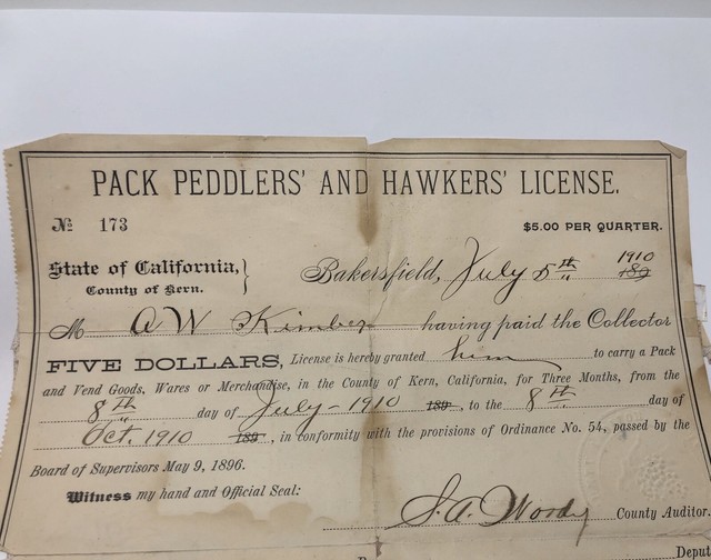 Vintage Pack Peddlers' and Hawkers' License California July 1910 Estate