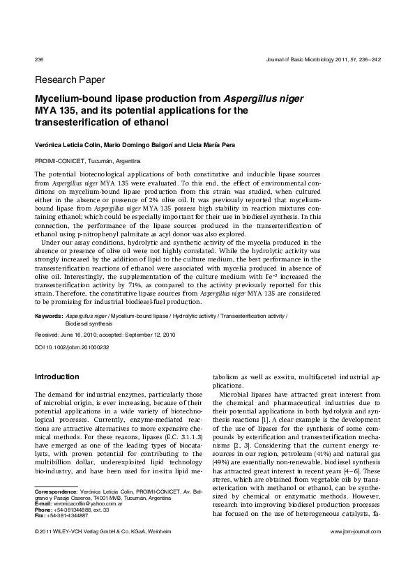 (PDF) Myceliumbound lipase production from Aspergillus niger MYA 135