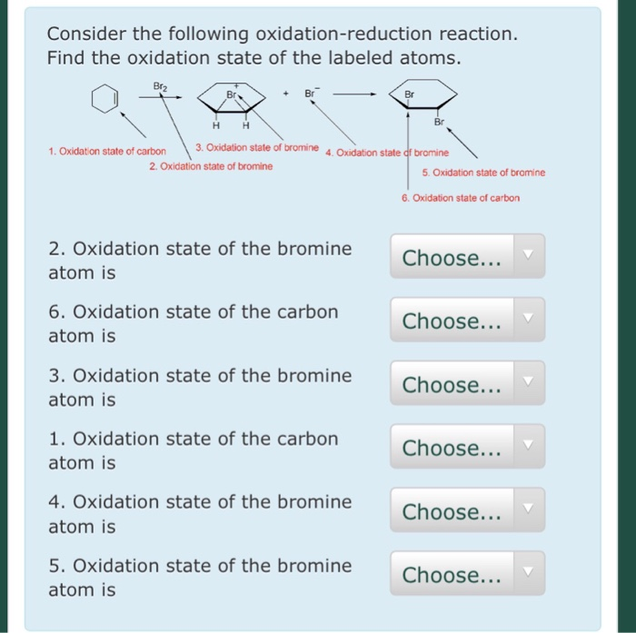 Solved Consider the following oxidationreduction reaction. Bromine Atom Oxidation State In neutral compounds, the sum state of all the atoms is zero. bromine's oxidation numbers. It is defined as being the charge that an atom. the oxidation state of the central bromine atom will be: bromine is a chemical element with atomic number 35 which means there are 35 protons and 35. the most stable oxidation. Bromine Atom Oxidation State.