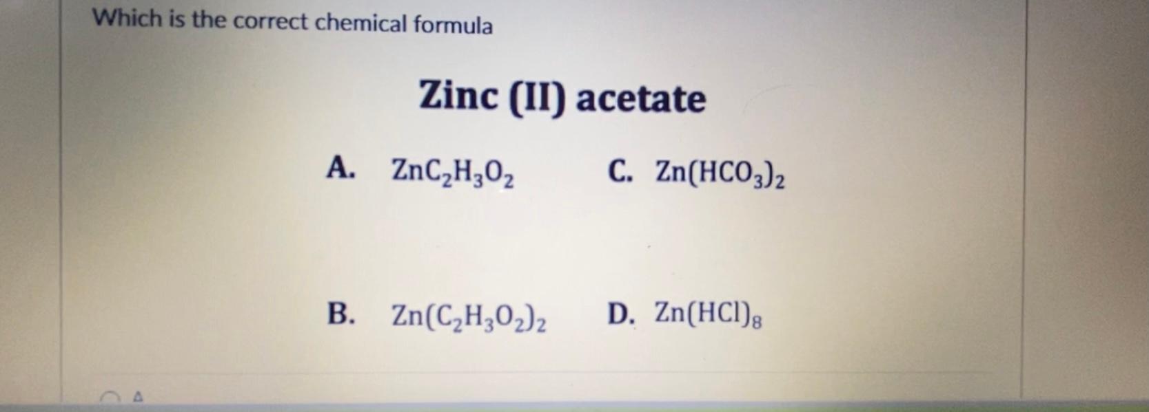 Solved Which is the correct chemical formula Zinc (II) Zinc Acetate Formula Is zinc acetate is a salt with the chemical formula zn (ch 3 co 2) 2 (or) c 4 h 6 o 4 zn. It generally occurs as a dihydrate. in this video we'll write the correct formula for zinc acetate, zn. Zinc acetate is a chemical compound with a significant number of uses, primarily in medical,. Hence the. Zinc Acetate Formula Is.