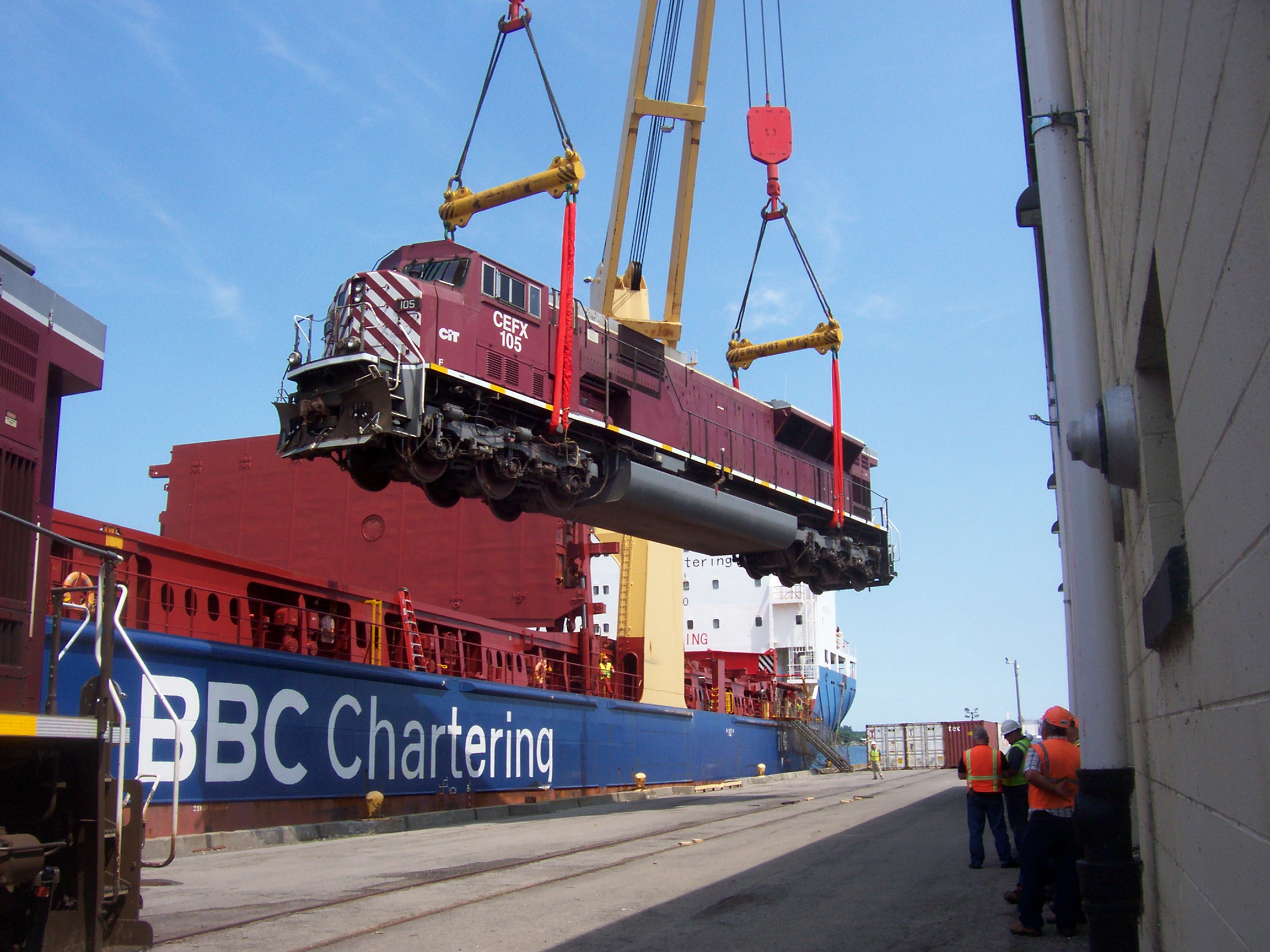 Longshoremen loading a onto a ship in the Port of Ogdensburg