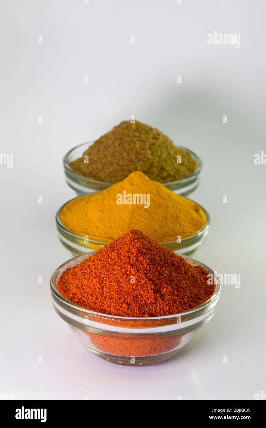 Spice Powder Chili, Turmeric & Coriander in Bowl isolated on White