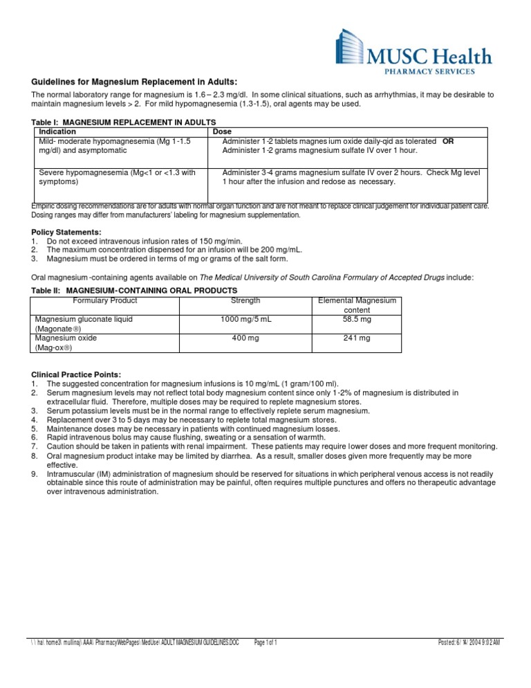 Adult Magnesium Guidelines Magnesium Intravenous Therapy