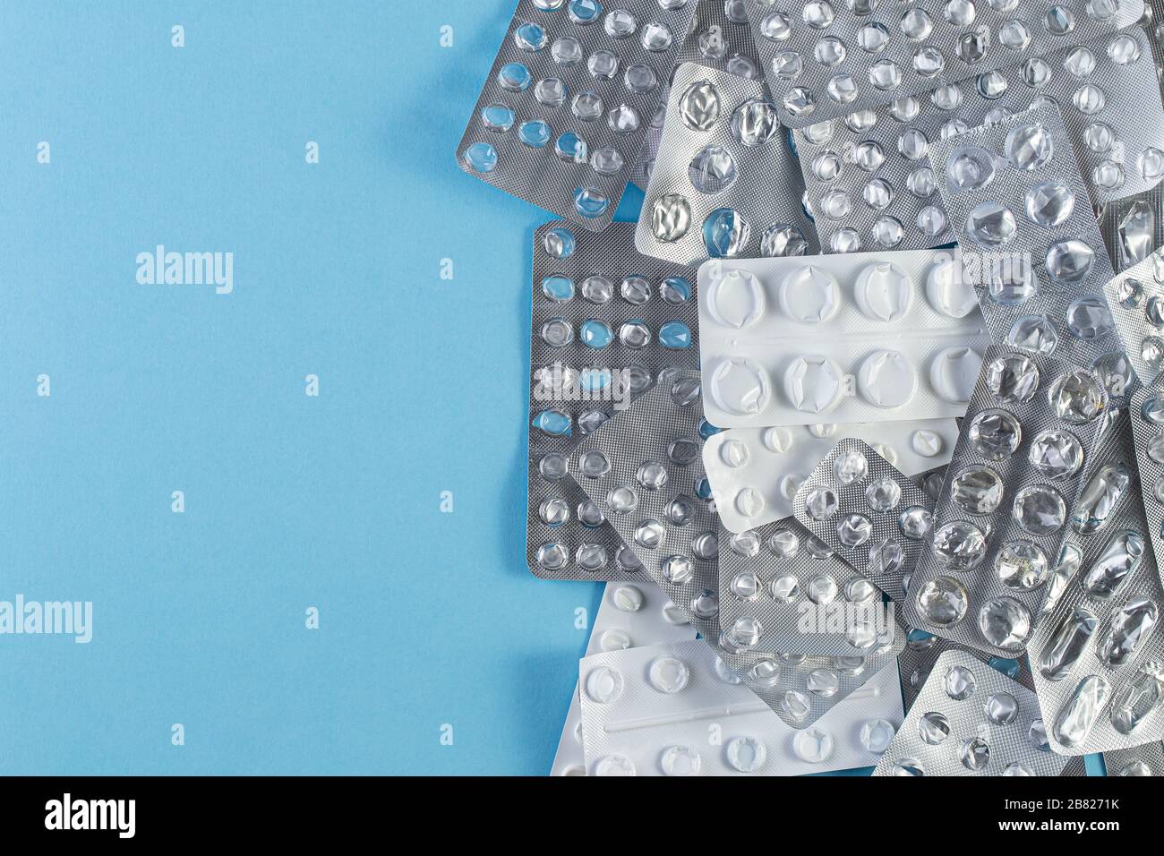 A pile Used blister packs of pills on blue background. Medical blisters