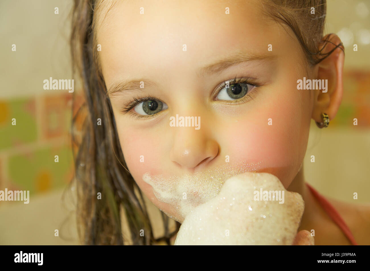 little beautiful girl playing with water and foam with her mouth in
