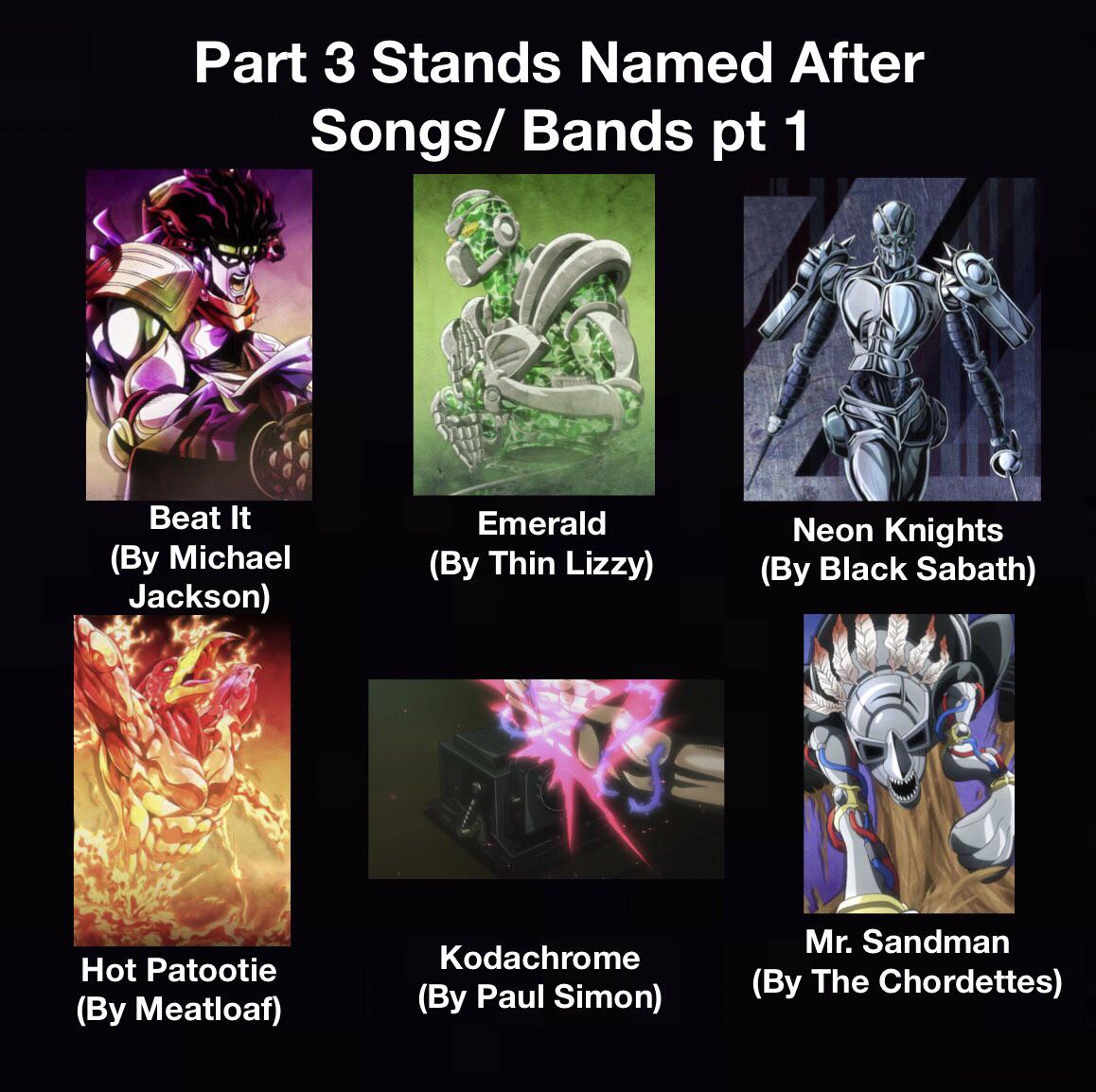 All preexisting official stand names (Just the stands named after Stands Named After Songs I tried renaming the part 3 stands so that they will be musical references. This post will list (in order of appearance) the names of every single stand in jojo's bizarre adventure which are named after. It's one of the things the series is known for. Jojo's bizarre adventure has a lot of music references. So i've devised this list. Stands Named After Songs.