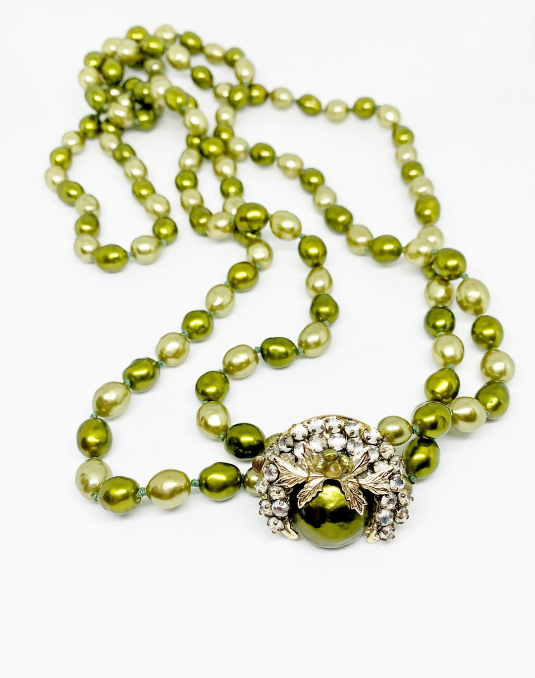 Double Strand Green Pearl Necklace Rhinestone Clasp Etsy