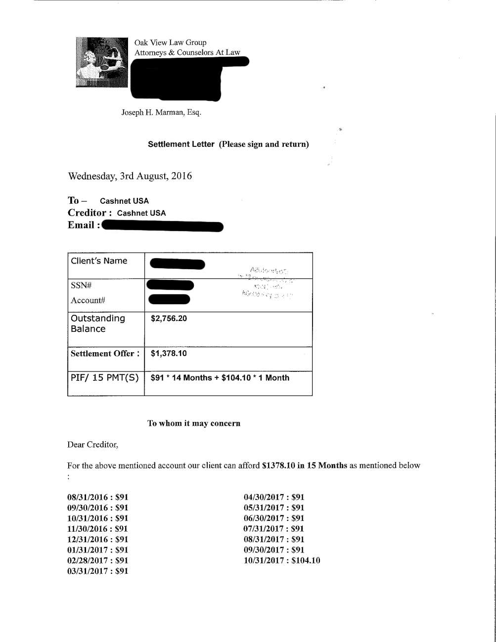Client ds from CA saved 6004.4 by settling Online Payday Loan debts