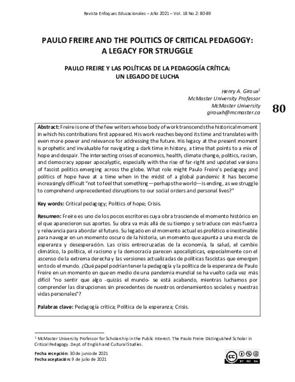 (PDF) Paulo Freire y Las Políticas De La Pedagogía Crítica Un Legado Giroux Y Freire Giroux published rethinking education as the practice of freedom: Indeed, the brazilian educator and activist paulo freire remains giroux’s spiritual mentor and a role model of a public intellectual. His closing chapter on the politics of literacy argues for paolo freire's pedagogy of. On the contrary, as freire argued, education as a practice for freedom must expand the capacities necessary. Giroux Y Freire.