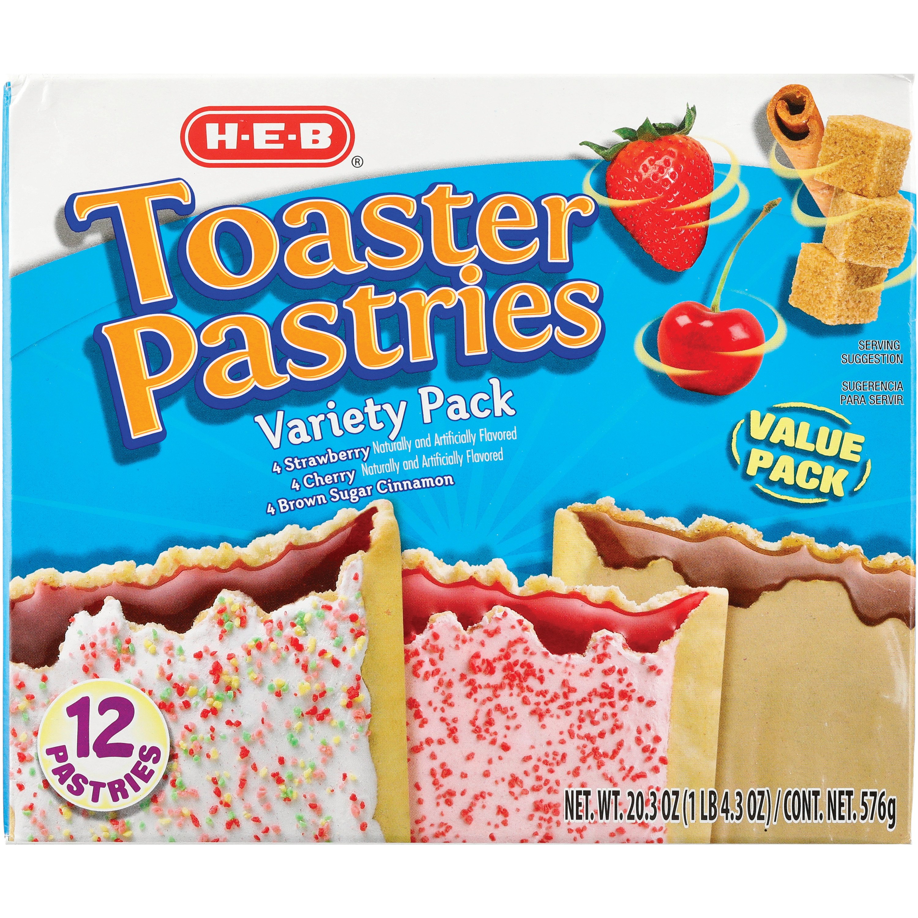 HEB Toaster Pastries Variety Value Pack Shop Cereal & Breakfast at Value Pack Toaster Pastries Each pastry boasts less fat, carbs, and sugar than most leading brands. 1 pastry of toaster pastries, frosted, chocolate fudge, value pack (frosted, chocolate fudge, value pack, pop tarts) contains 200 calories. 4.6 out of 5 stars. All varieties topped with delicious frosting; Soft toaster pastries with the flavors of strawberry, blueberry, or cherry; There's an impressive flavor selection, too. Value Pack Toaster Pastries.