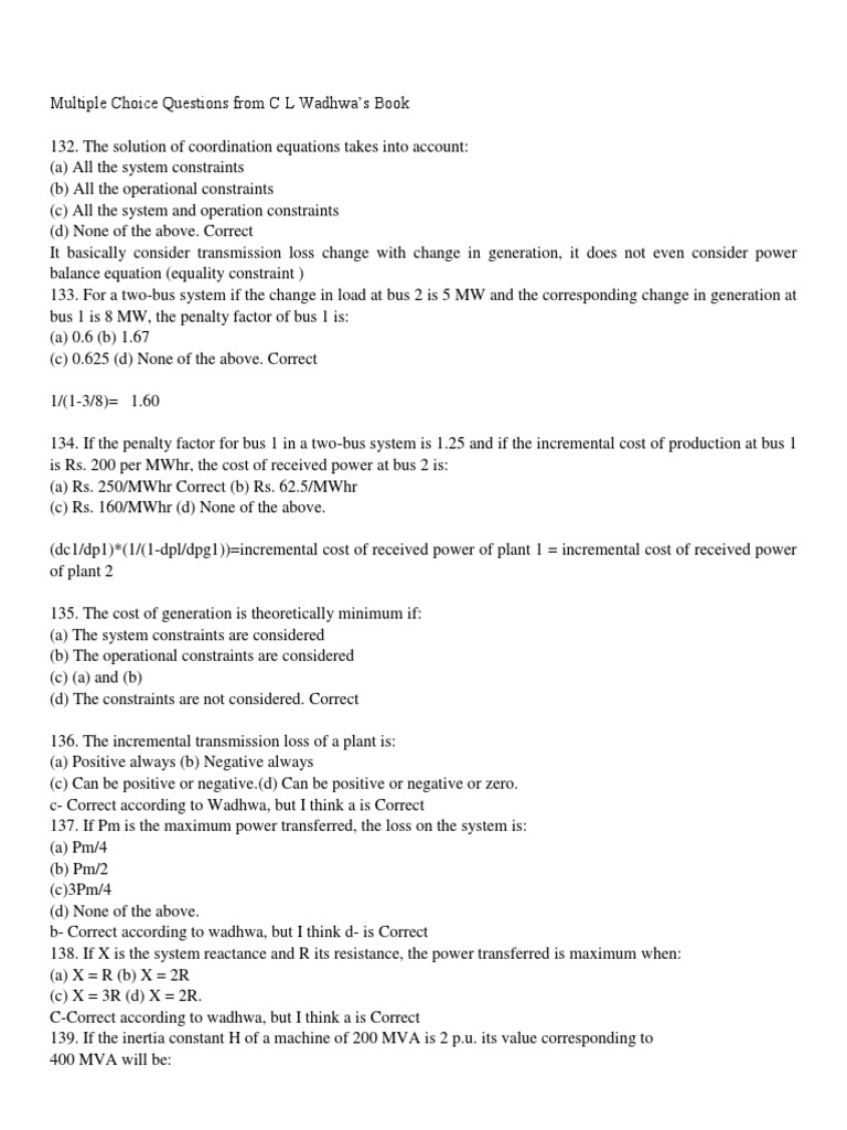 Multiple Choice Questions from C L Wadhwa’s Book on Power System
