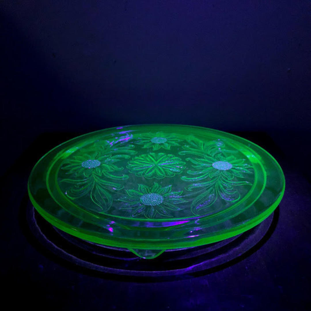 Vintage Glass Sunflower Uranium Glass Footed Cake Plate