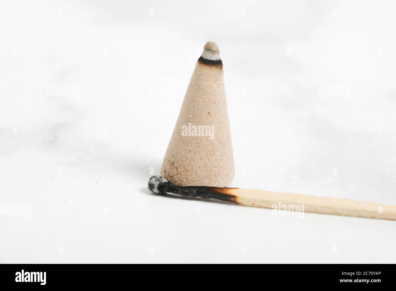 relaxation incense cone on white marble background. Good smell stick
