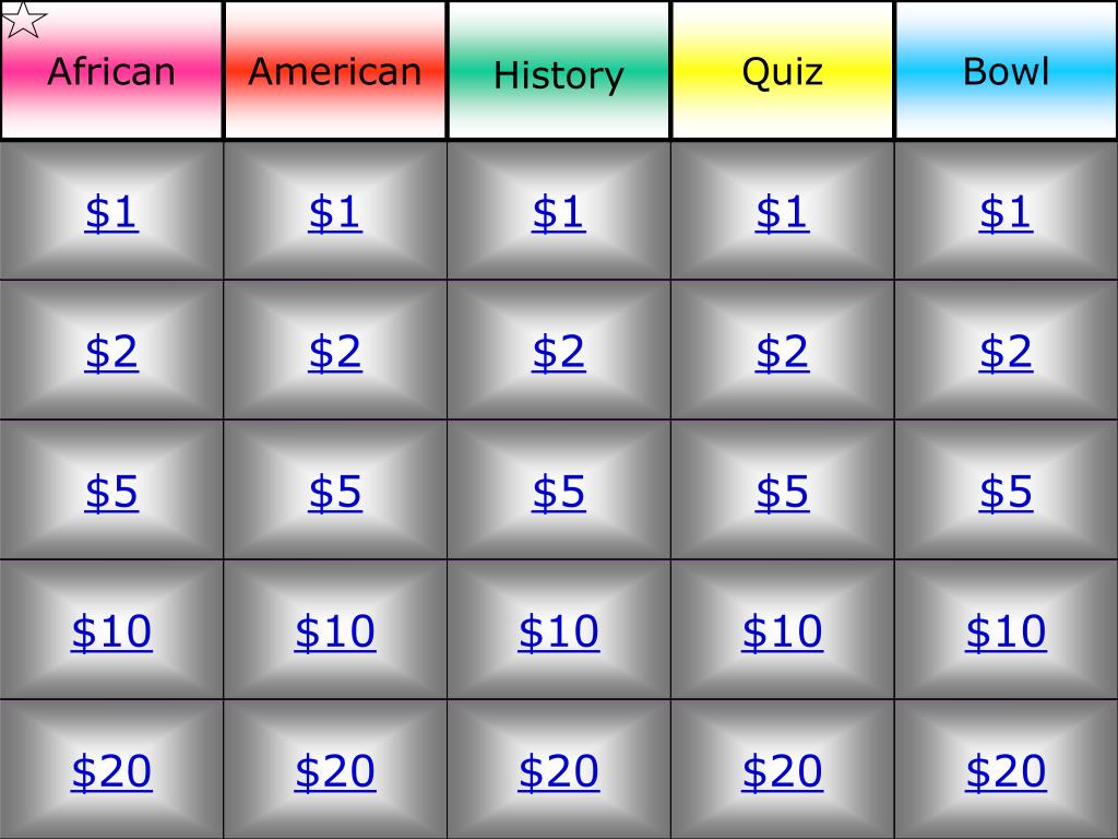 Jeopardy Trivia Game, Game, Quiz Black History Trivia Jeopardy In honor of black history month, we’ve pulled the following clues from the jeopardy! All you have to do is type the correct answer below. Results (10000 matching games) black history trivia (multiple choice). What is the name of the first black greek fraternity for college students?a. Black history jeopardy questions and answers. 3.7 (3 reviews) langston hughes was responsible. Black History Trivia Jeopardy.
