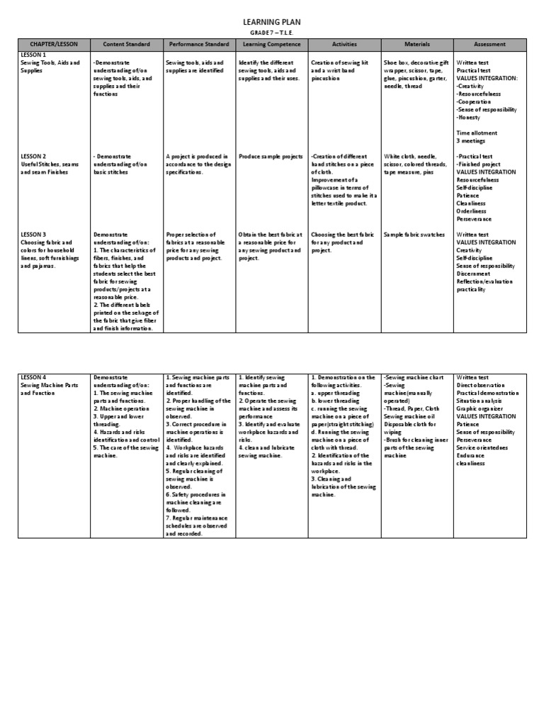 TLE Lesson Plan PDF Sewing Sewing Machine
