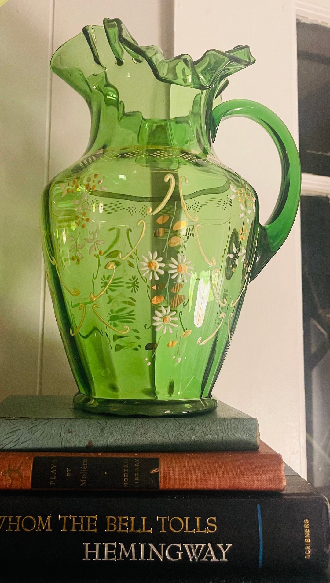 Green Hand Painted Depression Glass Ruffled Pitcher Floral Etsy Green Depression Glass Pitcher Value While some pieces sell for under $20, some of the most valuable depression glass patterns are worth hundreds. Many pieces of green depression glass are worth far less than others, yet others may reach. We have a great online selection at the lowest prices with fast & free. Get the best deals for depression glass pitchers green at ebay.com. Get. Green Depression Glass Pitcher Value.