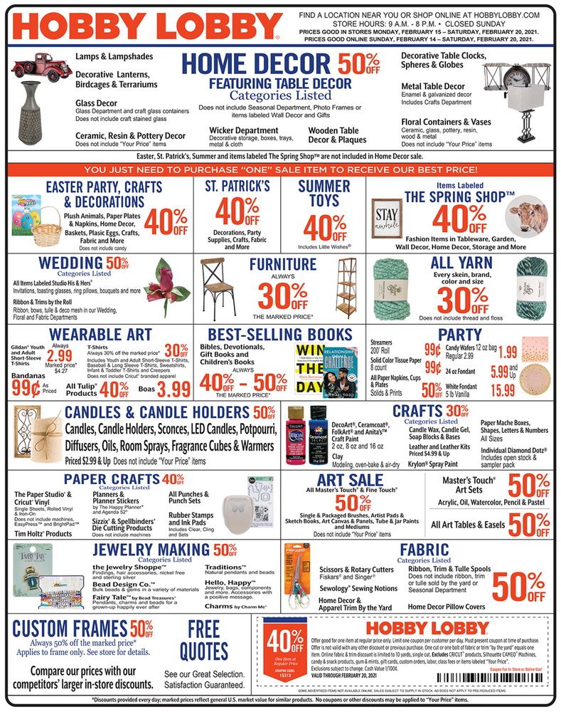 Hobby Lobby Weekly Ad Feb 14 Feb 20, 2021 Hobby Lobby Changes 2021 The arts and crafts chain said starting feb. The days of shopping at hobby lobby with a 40% coupon are numbered. In february 2021, hobby lobby discontinued its popular 40% off coupon leaving a lot of people wondering when they can score. Hobby lobby, an arts and crafts store chain, is reportedly canceling its 40% off coupon that is offered. Hobby Lobby Changes 2021.