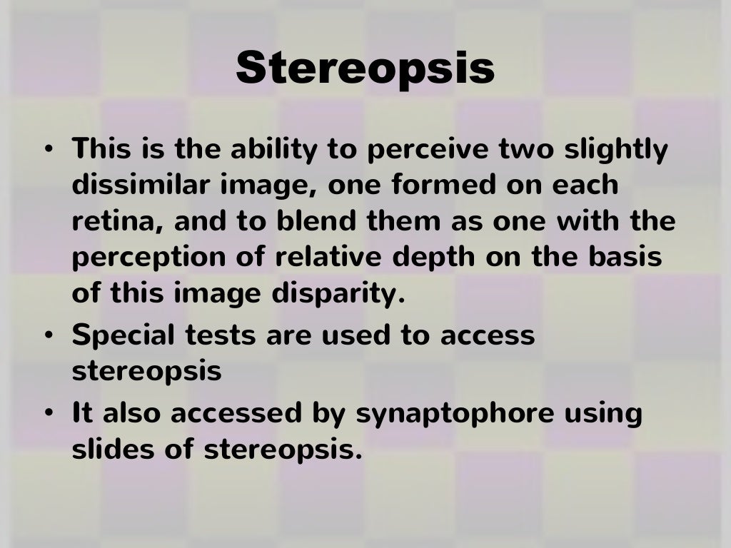 PPT Psychology 4051 PowerPoint Presentation, free download ID1785609 The Medical Term Stereopsis Refers To Stereopsis, also known as stereoscopic depth perception, is the ability of both eyes to see the same object as one image and to create a perception of depth. Stereopsis refers to the perception of depth that occurs due to the slight positional differences in the images received by each eye. It’s all thanks to an incredible process called stereopsis. In. The Medical Term Stereopsis Refers To.