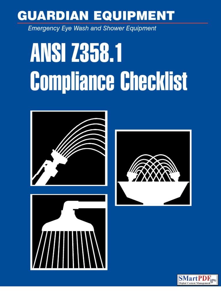 — ansi z358.1 provides detailed information regarding the installation and operation of emergency eyewash and. minimum requirements for the performance, use, installation, testing, maintenance and training of emergency safety shower and. It covers the following types of equipment: — ansi z358 requires emergency shower and eyewash stations to provide tepid water in the range of 60 f to 100 f. In addition to addressing design. all emergency eyewashes, eye/face washes, showers and combination units are required to be fully inspected annually to ensure. the selection of emergency eyewash and shower equipment is often a complicated process. — ansi z358.1 states that eyewash facilities should deliver flushing fluid to the eyes for not less than 1.5 liters. the standard defines emergency eyewash and shower requirements for: the ansi standard for eyewashes specifies that eyewashes must be capable of delivering tepid flushing fluid to the eyes.