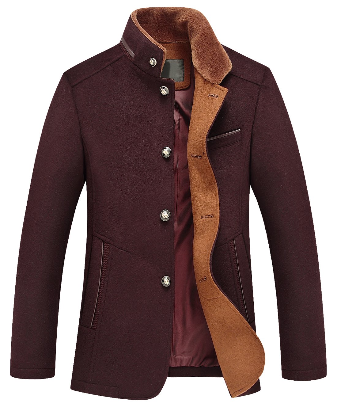 Chouyatou Men's Gentle Band Collar Single Breasted Wool Blend Pea Coat (10Dark Red, Small