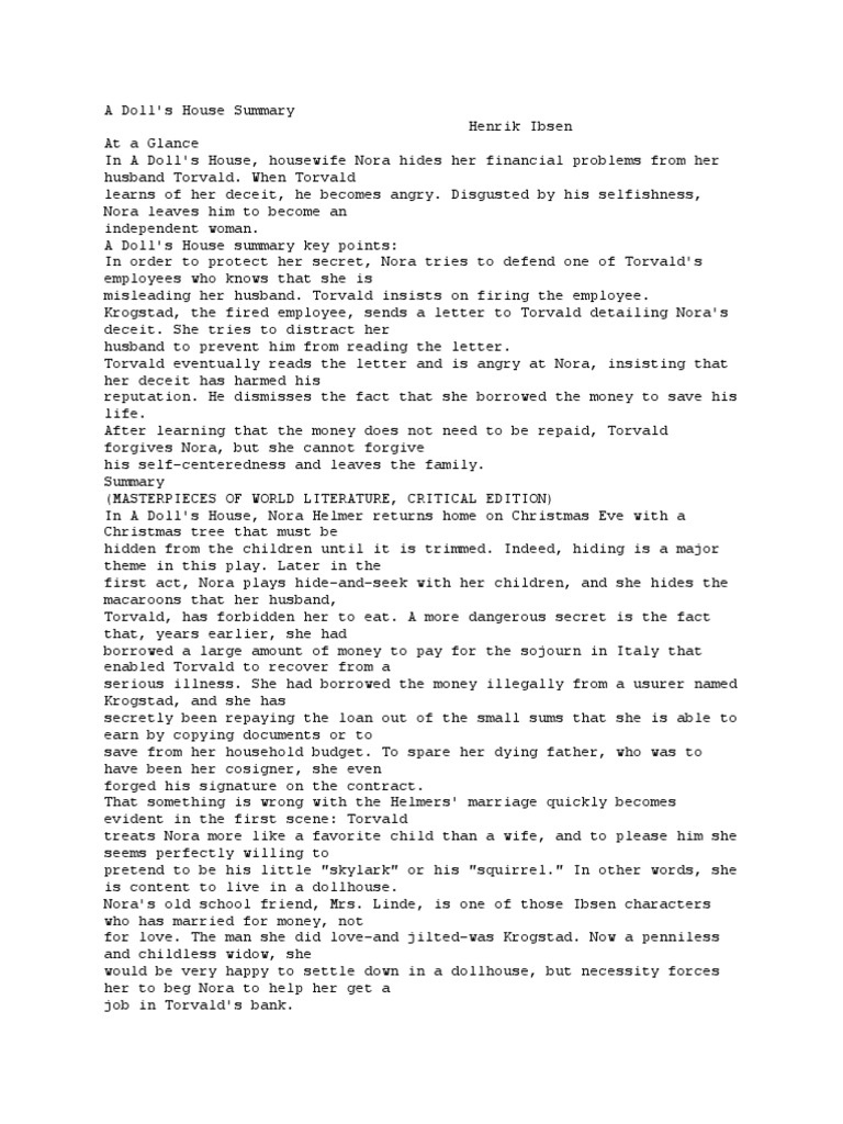 The Doll's House. summary The Doll's House (By Henrik Ibsen) Summary A Doll's House Summary Course Hero a doll’s house is a modern tragedy released in 1879 by norwegian writer henrik ibsen. this study guide and infographic for henrik ibsen's a doll's house offer summary and analysis on themes, symbols, and other. Nora helmer has returned home from doing the christmas shopping. this study guide and infographic for henrik ibsen's a doll's house offer. A Doll's House Summary Course Hero.