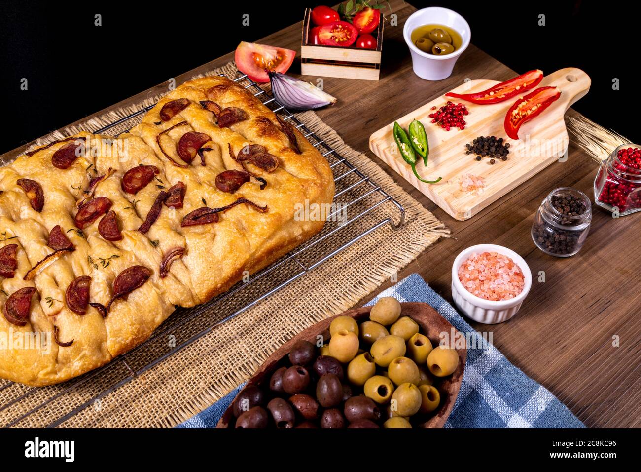 Traditional Italian Focaccia with pepperoni, cherry tomatoes, black