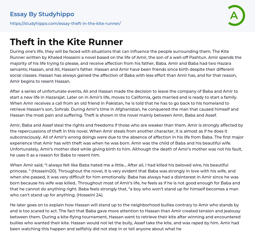 Theft in the Kite Runner Essay Example