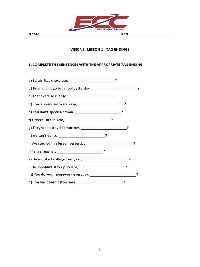 NAME REG. Visions Lesson 1 Tag Endings 1. Complete The