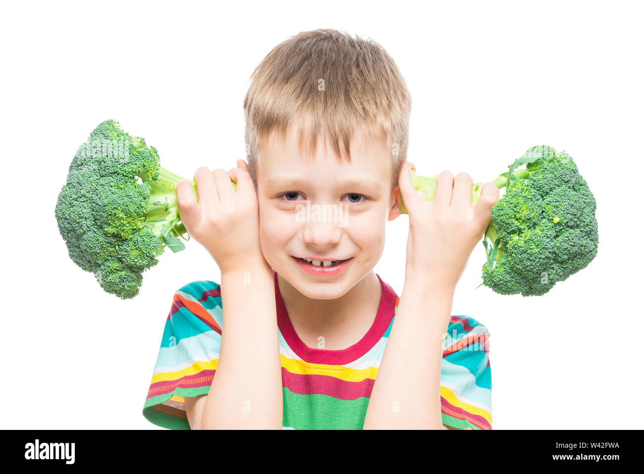 boy with broccoli, studio portrait on white background isolated Stock Photo Alamy