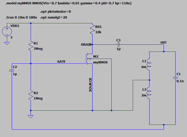 LTSPICE Dirty gate voltage and low gain Hartley oscillator using Hartley Oscillator Ltspice The hartley oscillator design uses two inductive coils in series with a parallel capacitor to form its resonance tank circuit producing sinusoidal oscillations. The hartley configuration can be. The hartley oscillator is a particularly good circuit for producing fairly low distortion sine wave signals in the rf range, 30khz to 30mhz. Your 384 ohm resistor is in the wrong place:. Hartley Oscillator Ltspice.