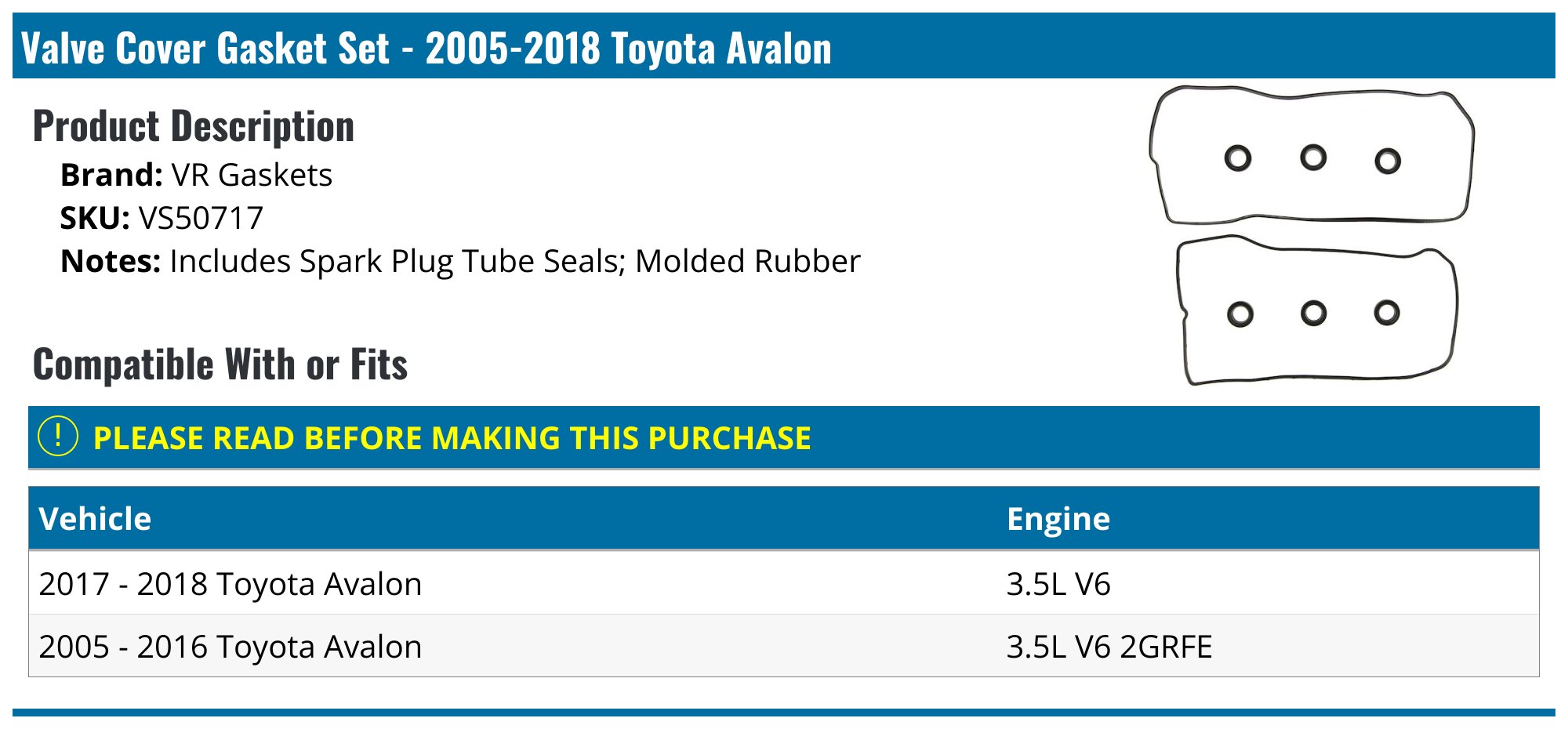 20052018 Toyota Avalon Valve Cover Gasket VR Gaskets VS50717