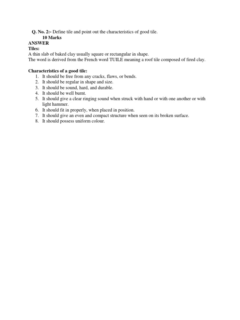 Q. No. 2Define Tile and Point Out The Characteristics of Good Tile. 10 Marks Answer Tiles PDF