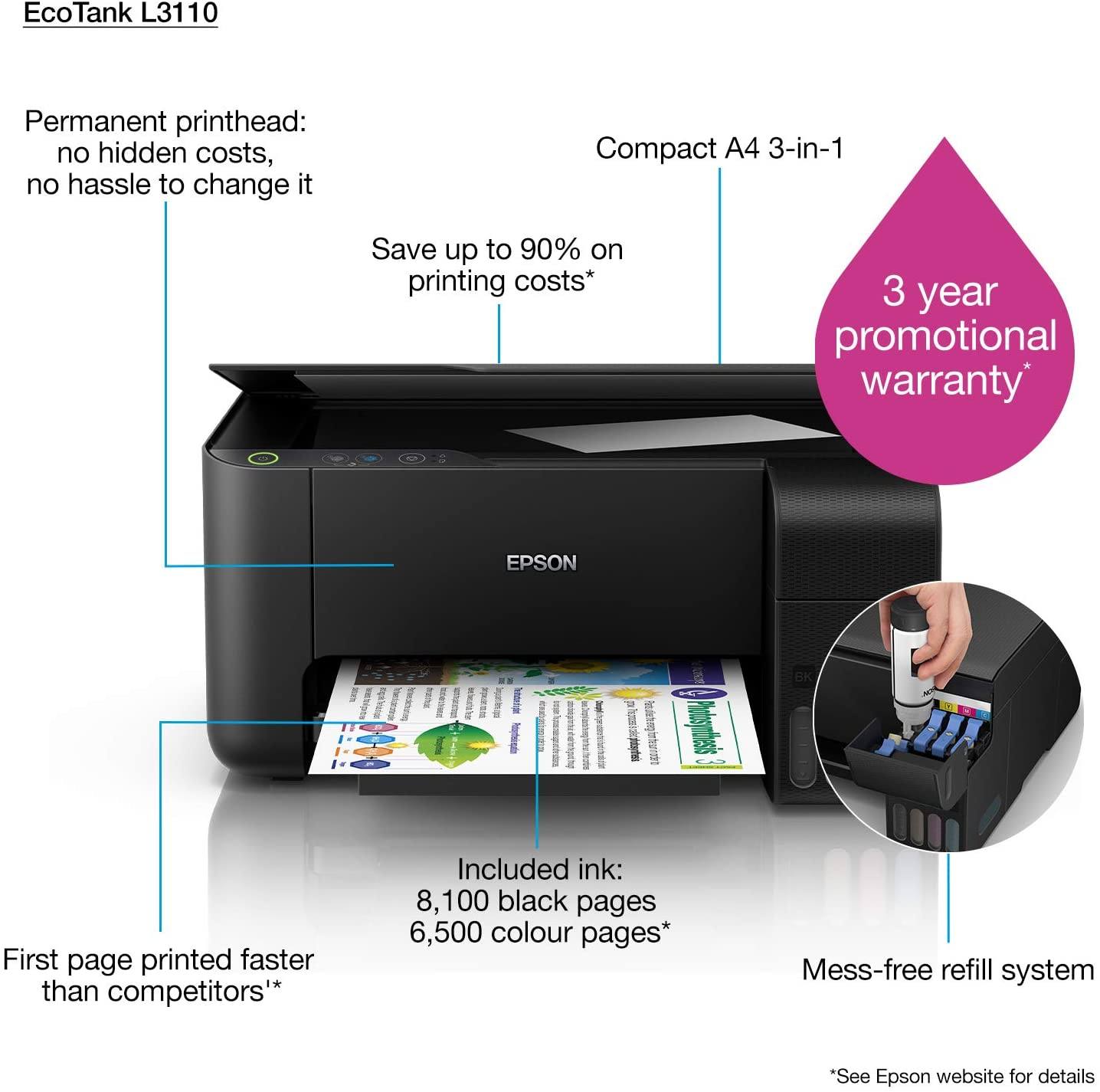 Epson EcoTank L3110 AllinOne Printer Epson L3110 Printing Cost With great savings and peace of mind in printing, the ecotank® l3110 allows you to print up to 7.500 pages in color1 or 4.500 pages in black1 with. Next generation ink filling system: Save up to 90% on the cost of ink 2; Printing costs calculated on the proportion of standard and xl cartridges as tracked by idc for the. Epson L3110 Printing Cost.