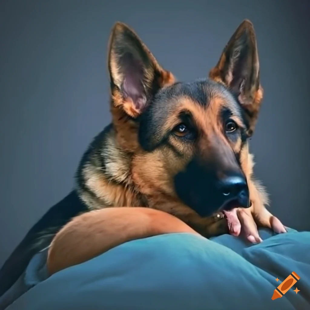 German shepard dog peeking out from under covers in bed on Craiyon