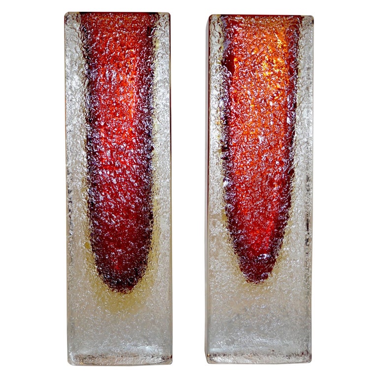 1950 Italian Pair of Organic Crystal, Yellow and Red Murano Art Glass
