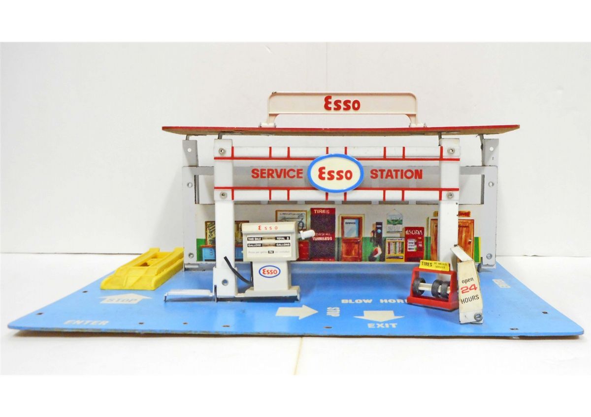 C. 1970S ESSO TIN LITHO & WOOD FOLD UP GAS STATION TOY