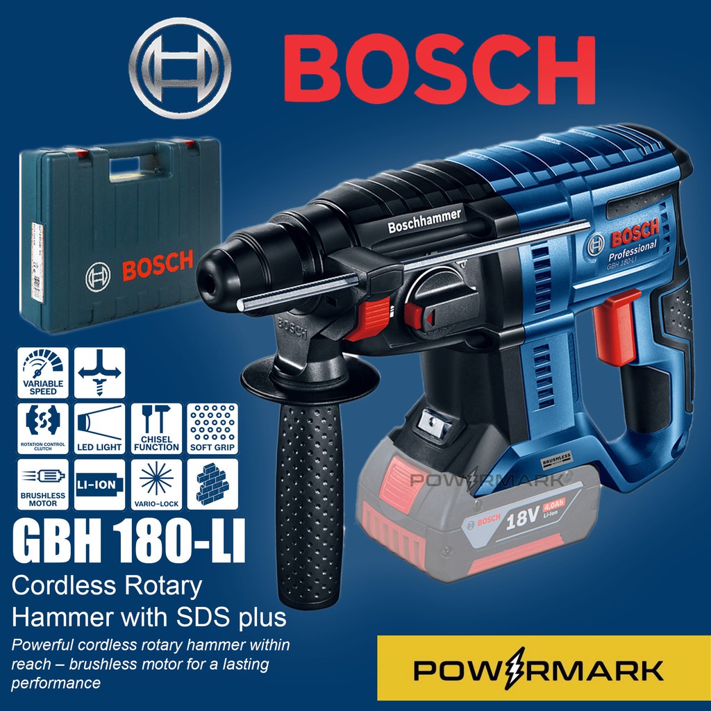 BOSCH GBH 180 LI Cordless Rotary Hammer (Brushless) GH Hardware Sdn Bhd Bosch Brushless Rotary Hammer Drill No sparks and less heat generation. Powerful impact system with 2.0 j, 3 mode hammer for versatile usage. Reduced maintenance due to brushless motor and increased runtime per battery charge. The rotary hammer is perfect for drilling and chiselling in concrete, stone, rock, and brickwork and is compatible with all bosch professional 18 v. Bosch Brushless Rotary Hammer Drill.
