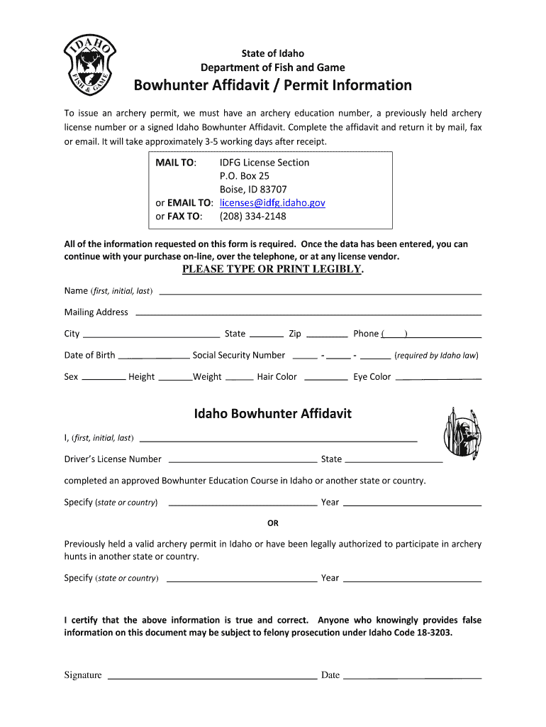 Idaho Affadavit PDF Complete with ease airSlate SignNow Idaho Archery Affidavit To buy an archery permit, all bowhunters ages 9 and older must possess a valid hunting license and show proof they have completed an approved bowhunter education course or show evidence of. To buy an archery permit, all bow hunters must possess a valid hunting license and show proof they have completed an approved bow hunter education course or show. Idaho Archery Affidavit.