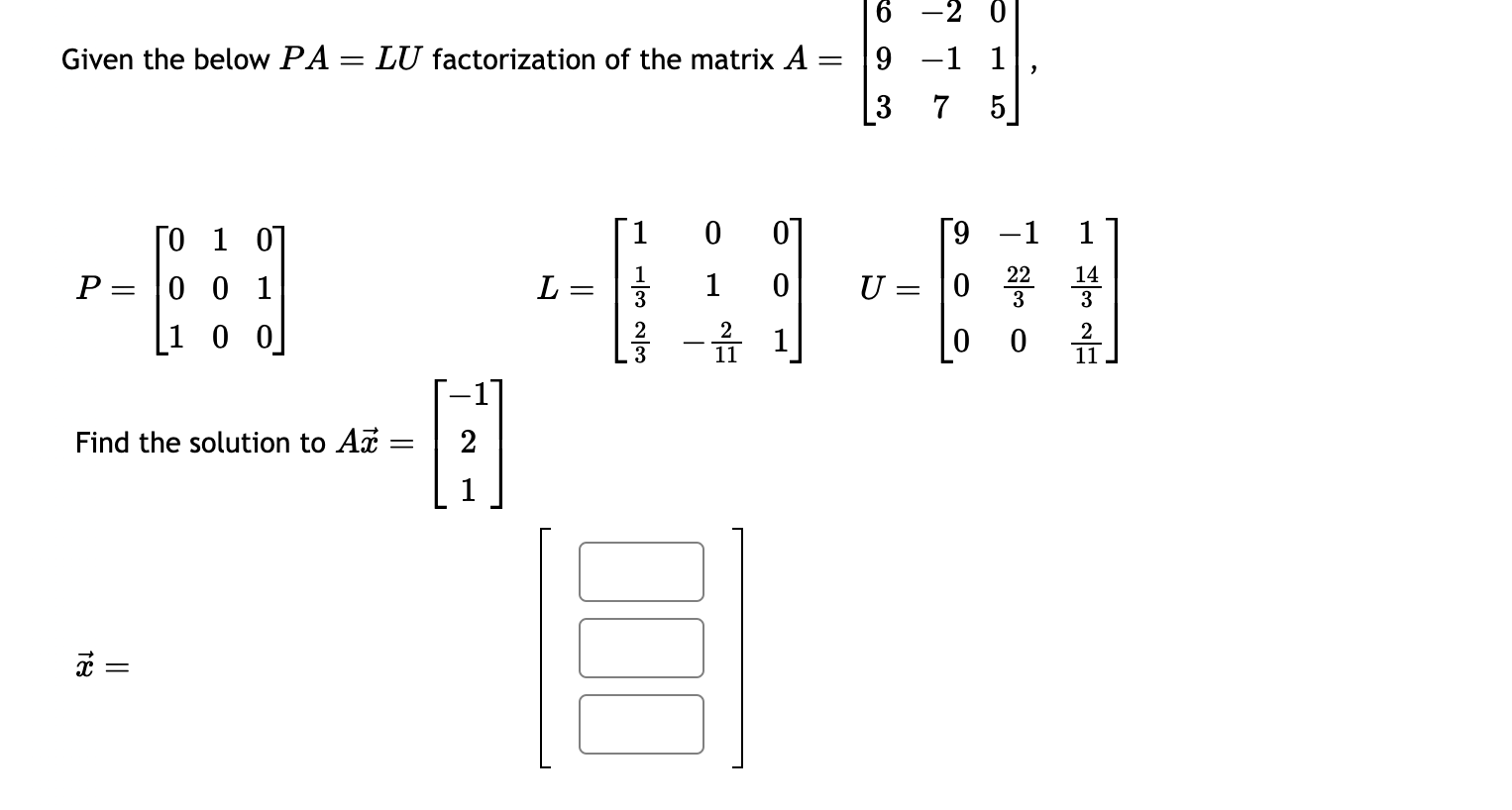 Solved Given the below PA=LU factorization of the matrix Pa Lu Factorization Calculator Lu matrix decomposition calculator is an online matrix calculator that is used to factorize a square of any order into two distinct. The lu decomposition calculator is a powerful tool used to decompose a square matrix into two triangular matrices, l (lower triangular. This lu decomposition calculator helps you write a given square matrix as a product of a lower. Pa Lu Factorization Calculator.