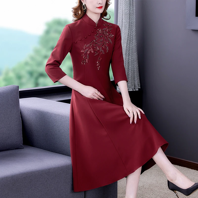 Women Red Fashion Embroidery Midi Dress Autumn Winter Korean Vintage Casual Party Dress 2022