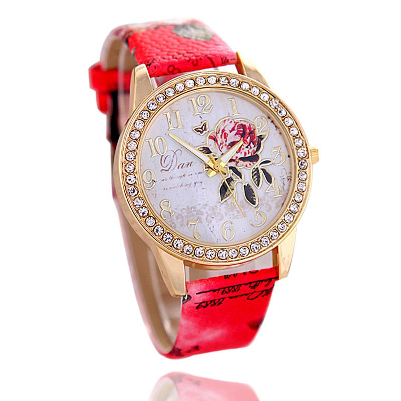 Fashion Printed Leather Ladies Watches Diamond Rose Pattern Gold Shell