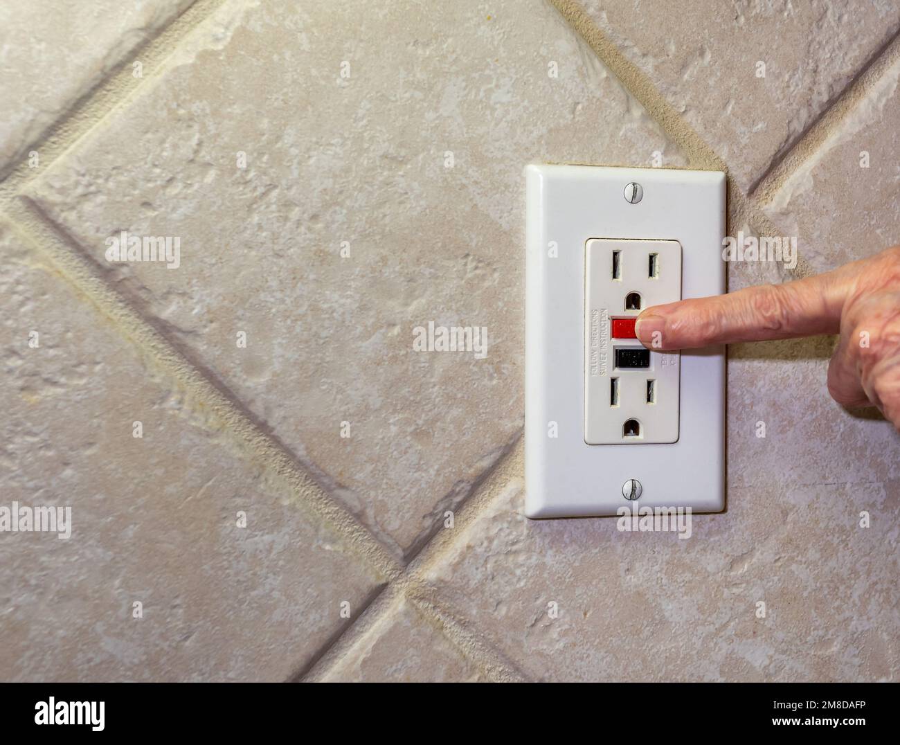 Closeup of hand resetting tripped GFI electricity receptacle