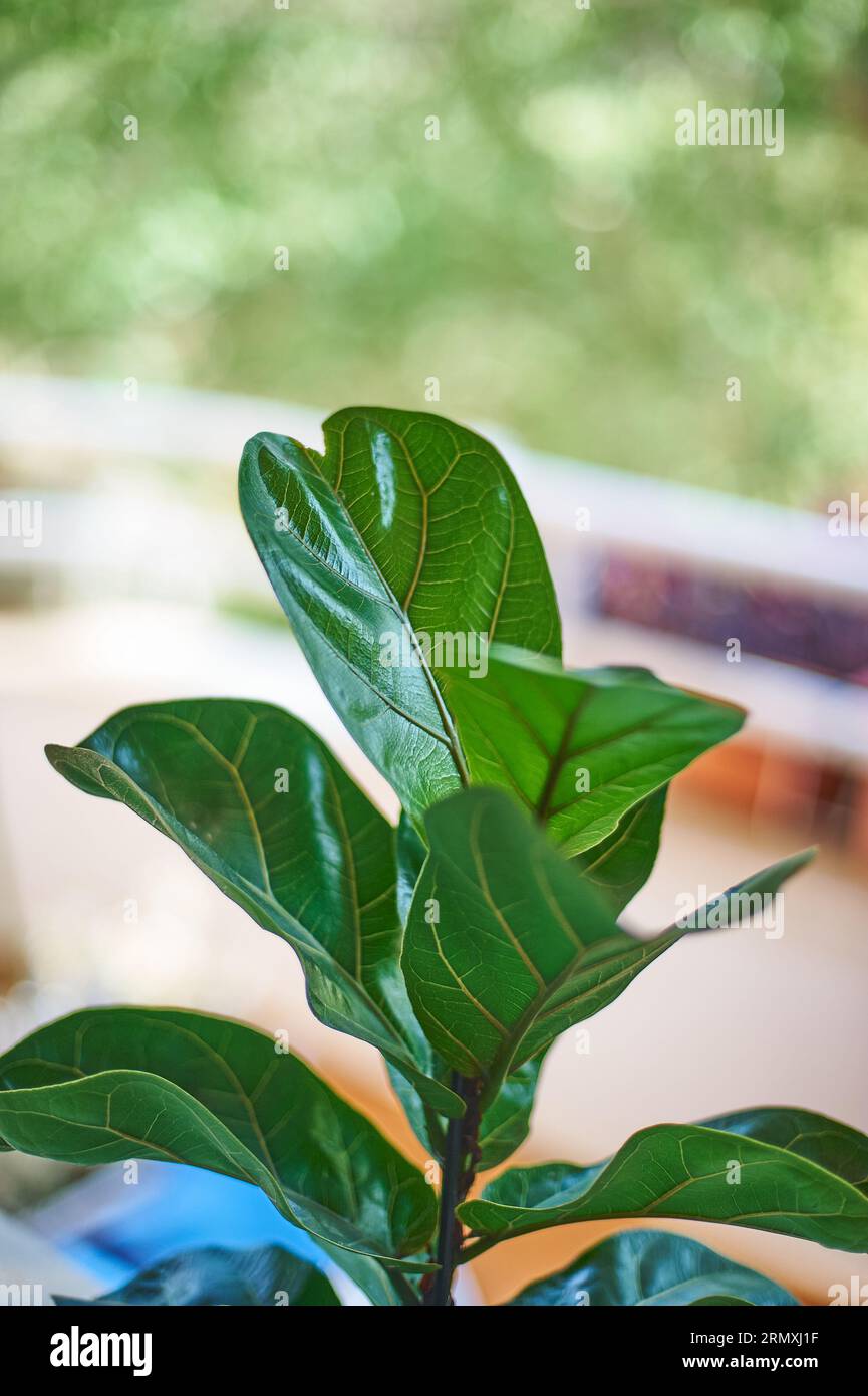 Detailed leaves of Ficus Lyrata. Indoor plant care concept Stock Photo