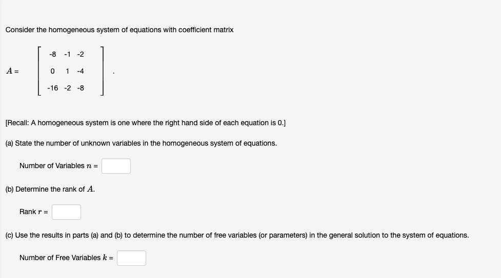 Solved Given the coefficient matrix of a homogeneous linear What Is A Homogeneous System In Matrix A system of equations in the variables \(x_1, x_2, \dots, x_n\) is called homogeneous if all the constant terms are zero—that is, if each. Learn how to find the trivial and nontrivial solutions of a homogeneous linear. Learn the definition, properties and examples of homogeneous systems of linear equations and their relation to the null space of a matrix. Learn. What Is A Homogeneous System In Matrix.