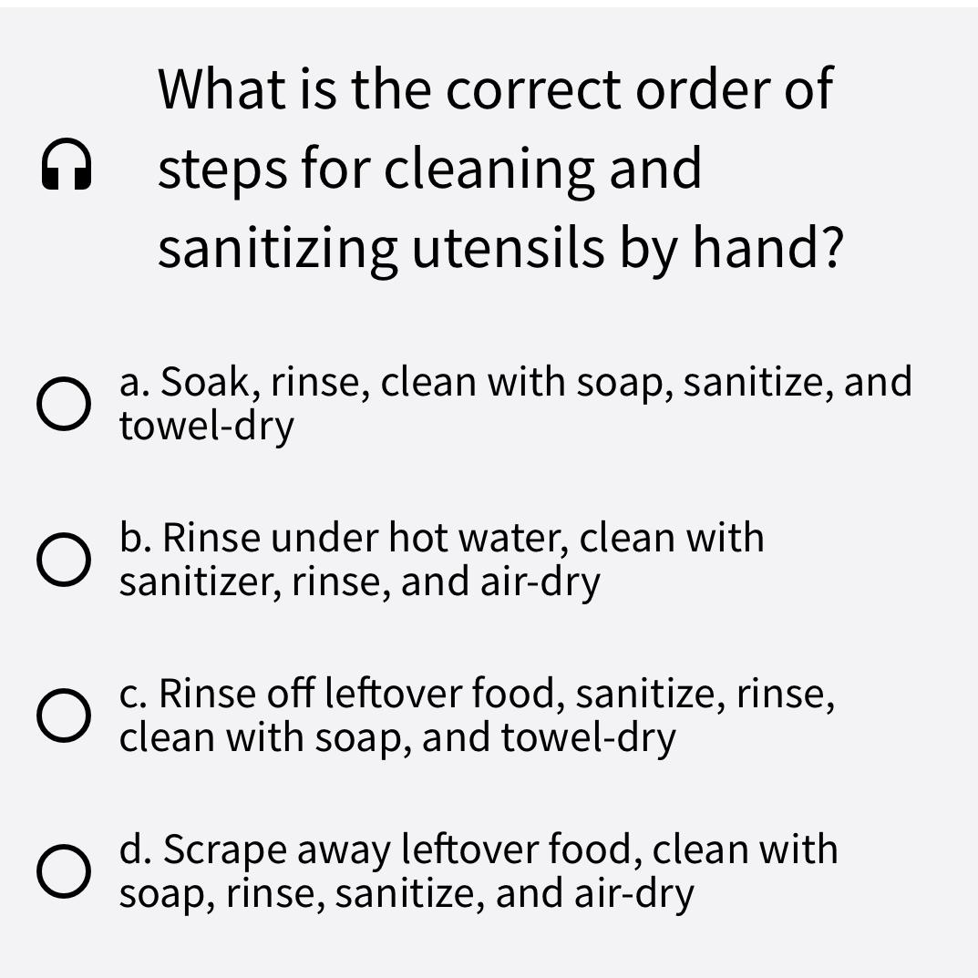 Solved What is the correct order of steps for cleaning and Cleaning And Sanitizing Utensils By Hand wash your hands before you start washing your dishes to prevent potentially spreading bacteria. Clean your kitchen utensils in hot water with an antibacterial detergent. Wash with warm water and. when it comes to food safety, knowing how to clean, sanitize, and disinfect dishes, utensils, surfaces, and other items that come in contact with your food is very. Cleaning And Sanitizing Utensils By Hand.