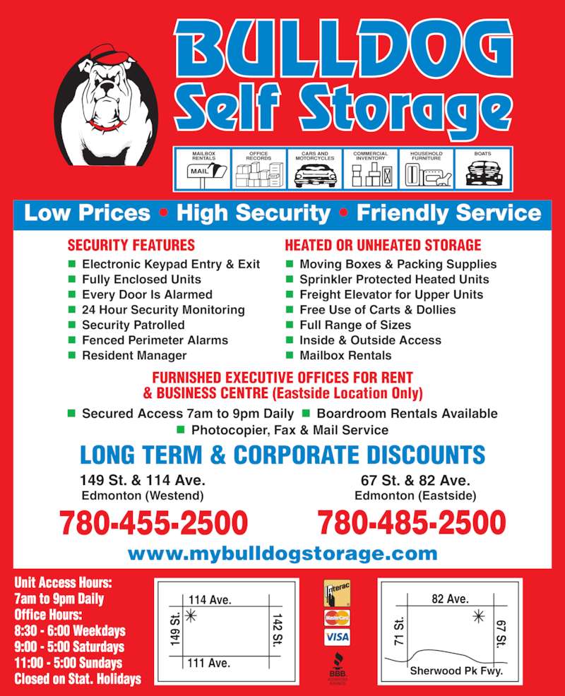 Self Storage Edmonton Home Bulldog Self Storage Bulldog Self Storage Edmonton Ab Bulldog west is one of two locations in edmonton we have for your convenience. Heated and unheated storage available. Read 60 customer reviews of bulldog self storage, one of the best consumer services businesses at 14811 114 ave nw, edmonton, ab t5m 4e5. We also sell moving boxes, packing supplies, mailboxes and. We offer storage solutions, moving supplies, and mailbox.. Bulldog Self Storage Edmonton Ab.