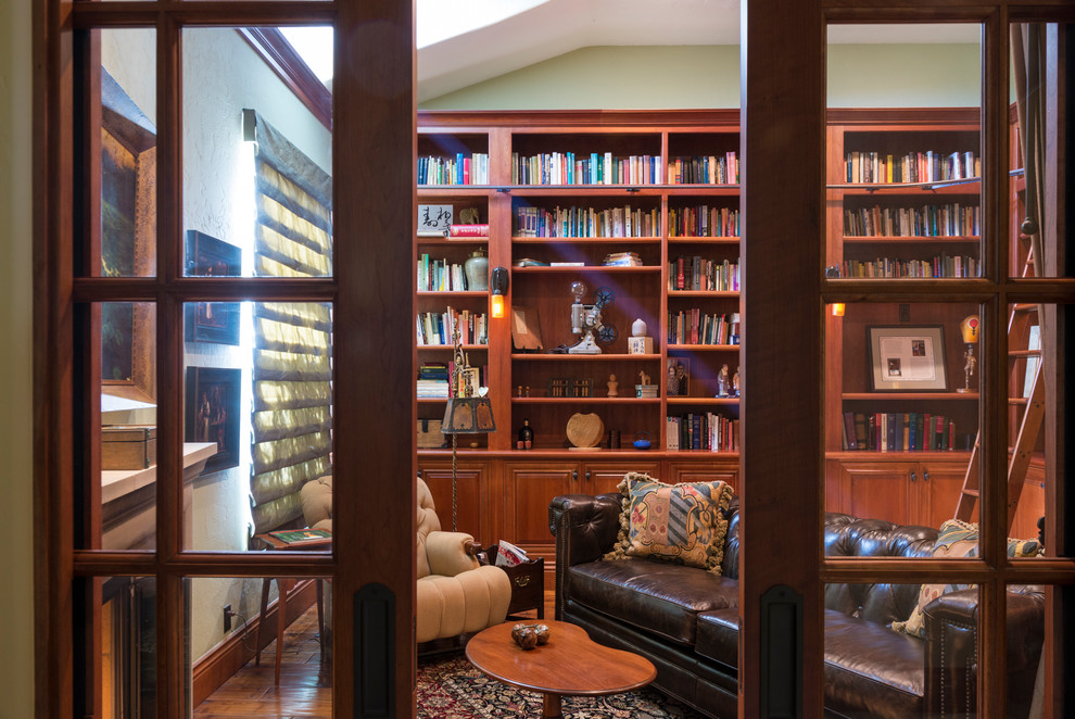Library with Glass Pocket Door Entry Traditional Family Room