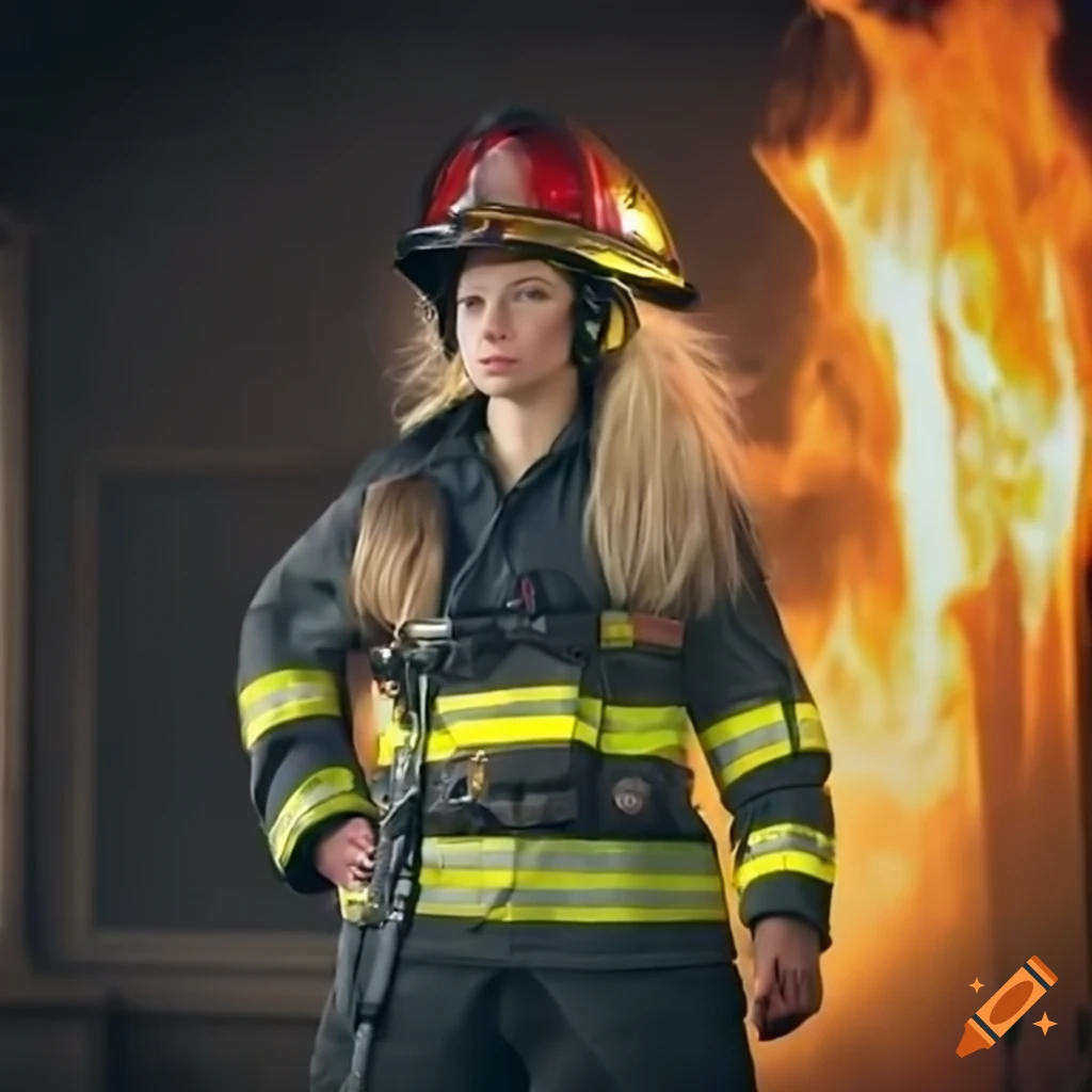 A female firefighter with blonde hair ready for action