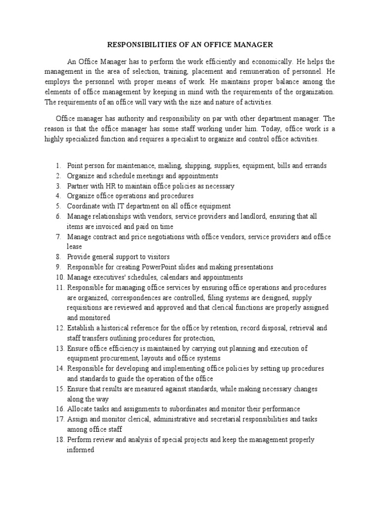 Responsibilities of An Office Manager PDF Employment Human Resources