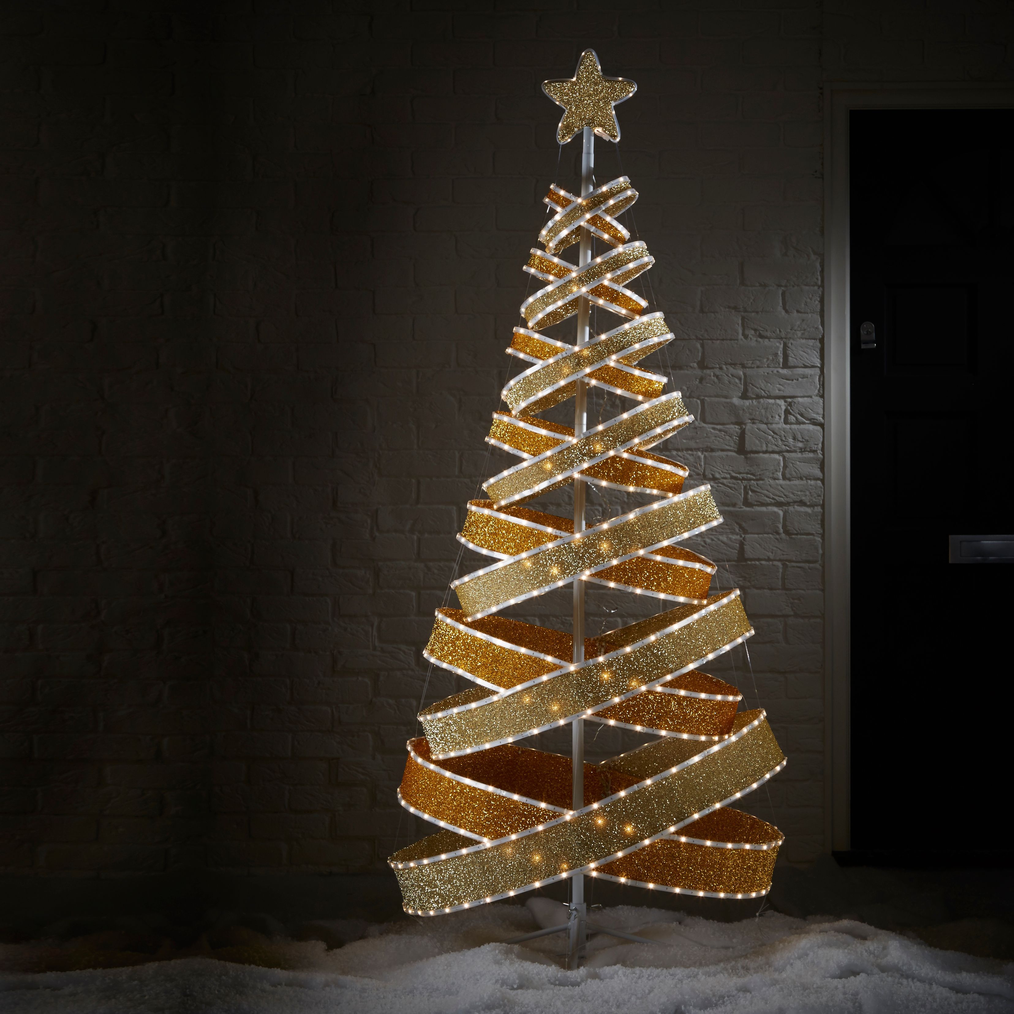 6ft Olympia Ribbon Champagne & Gold Effect Pop Up & PreLit Christmas Pop Up Christmas Tree 6 Ft Effortlessly set up our 6 ft christmas tree! It instantly pops up into a full tree. Includes a remote control with 21 lighting options and 4 ground stakes for outdoor. Pop Up Christmas Tree 6 Ft.